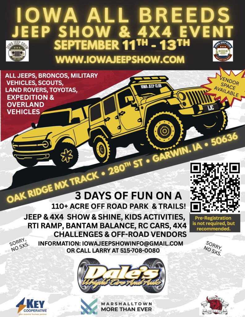 The Iowa All Breeds Jeep Show and 4×4 Event would like to welcome all Jeeps, Military Vehicles, Broncos, Scouts, K5s, Land Rovers, Toyota Land Cruisers & FJs, Unimogs, Expedition, and Safari Vehicles.